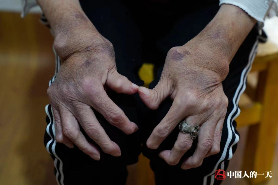 她的双手、双脚,以及身体其他部位因痛风严重变形,不得不找儿子来帮忙,