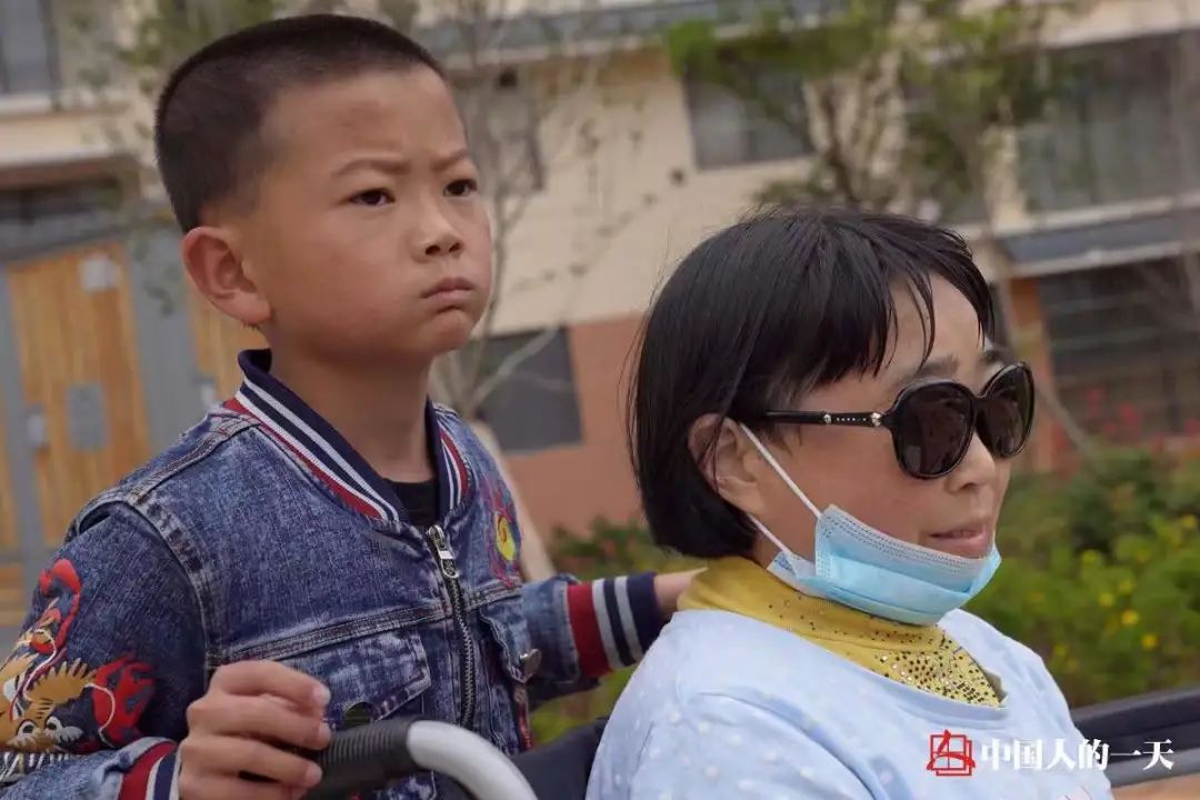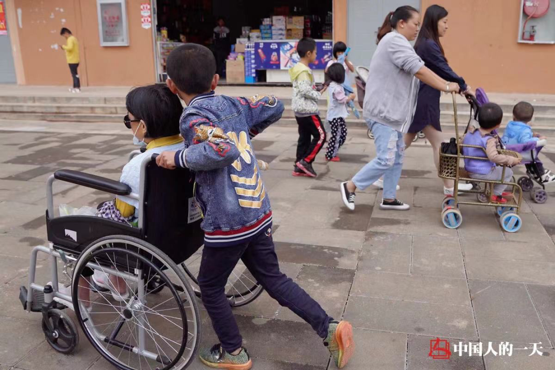 一个小男孩推着轮椅上的母亲,与几个推着童车的阿姨擦身而过。