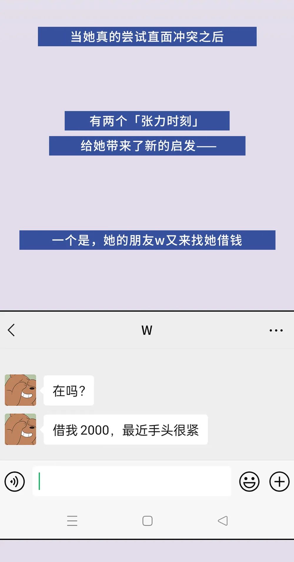 她说自己平时在人际关系里还算自在,可一旦察觉到关系有冲突的迹象,就会不自觉退缩、逃避——