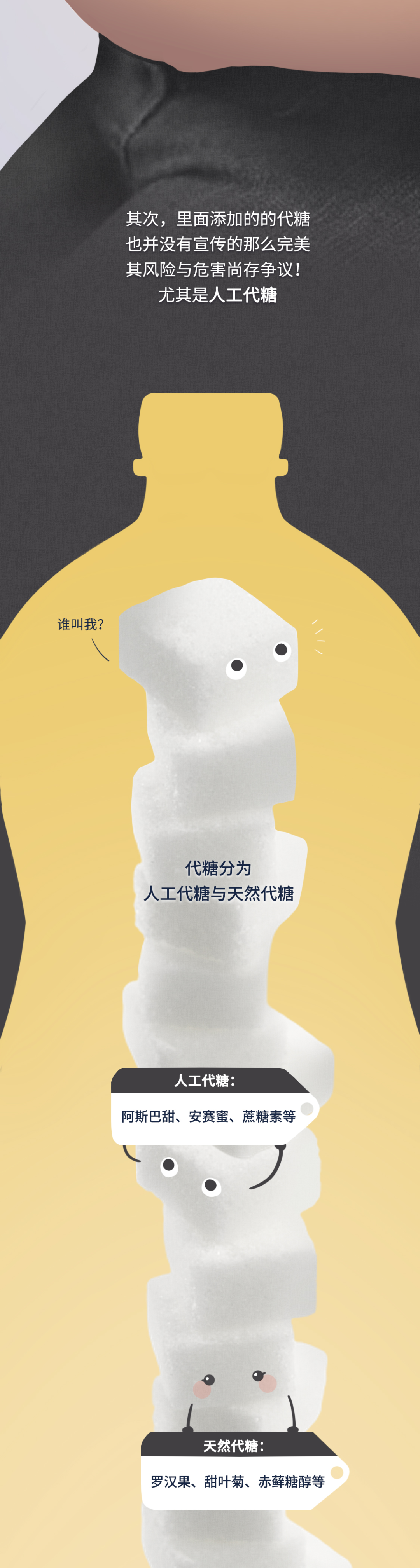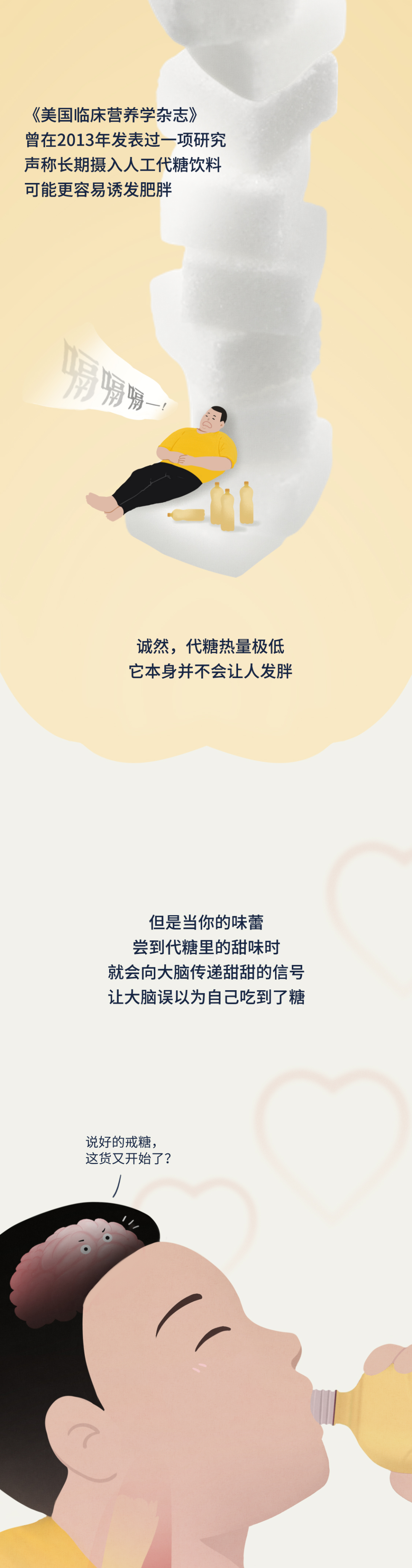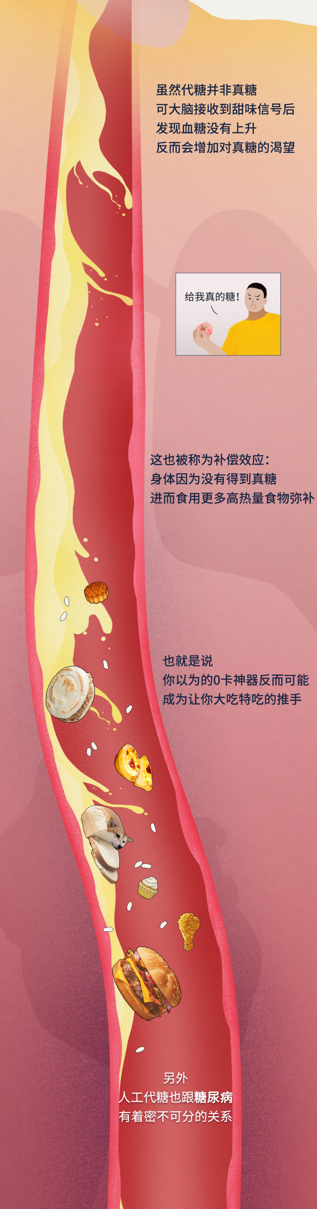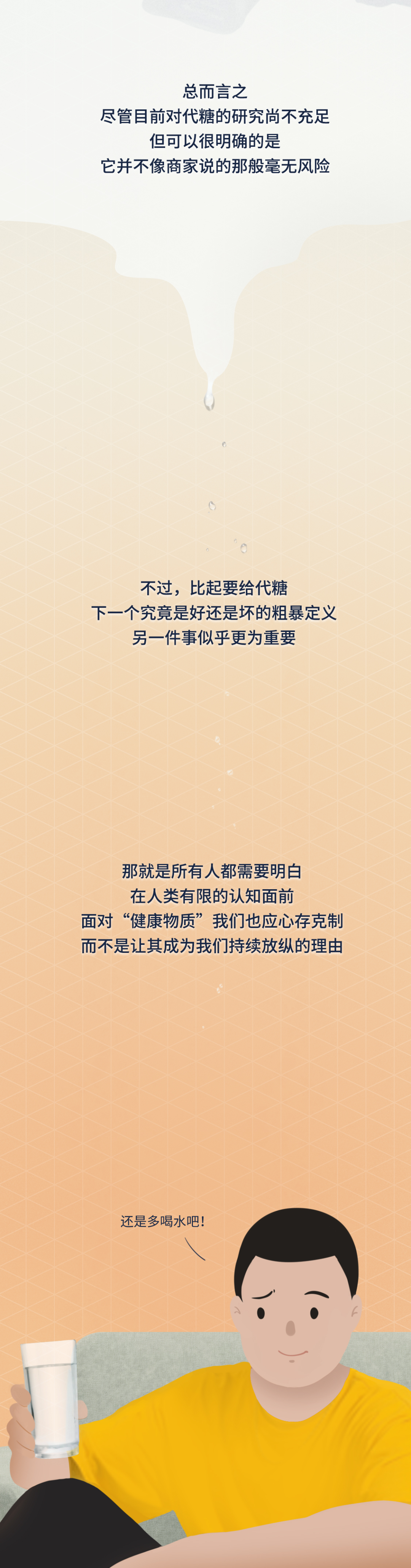 【写在最后】 有人可能发现了,关于代糖,文章里只提到了人工代糖,并未涉及自然代糖。其实目前科学界主流的看法是,人工代糖对身体的危害更甚,也有诱发糖尿病的风险。不过自