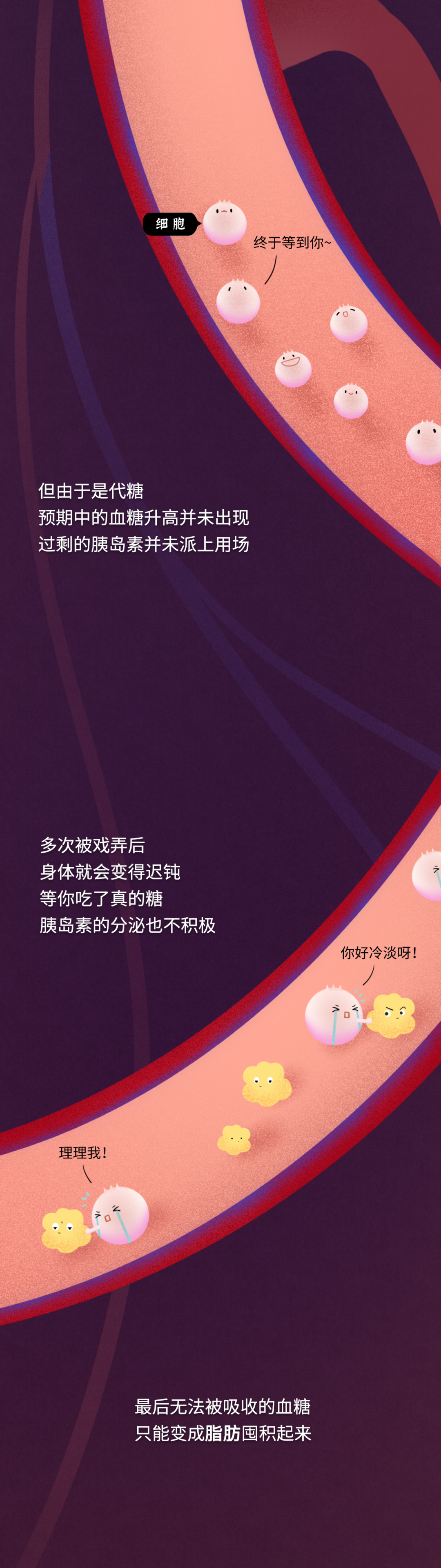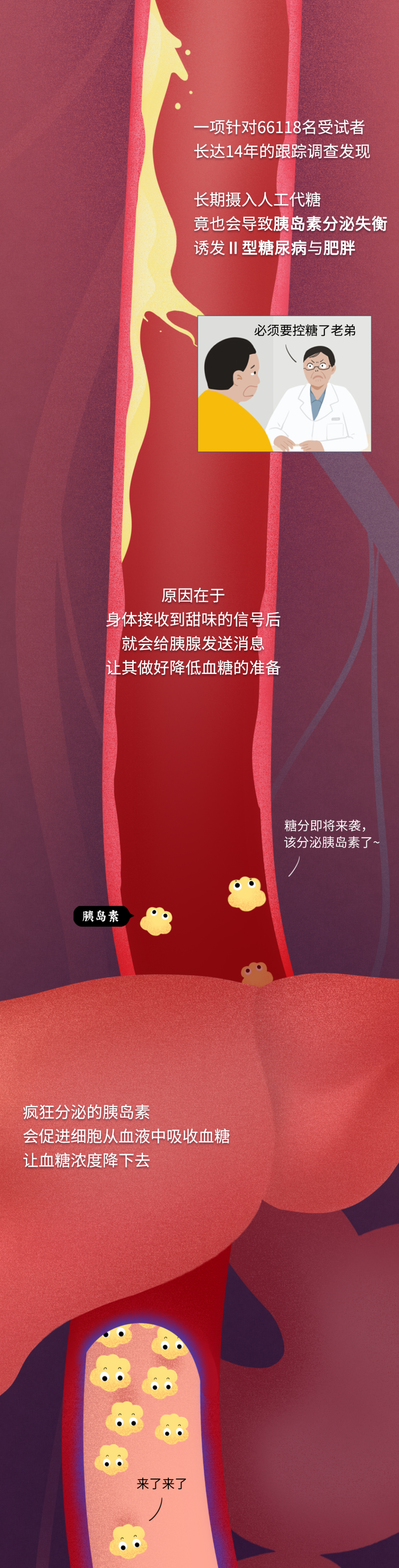 有人可能发现了,关于代糖,文章里只提到了人工代糖,并未涉及自然代糖。其实目前科学界主流的看法是,人工代糖对身体的危害更甚,也有诱发糖尿病的风险。不过自然代糖相对安全,以赤藓糖醇为例,它不会刺激胰岛素的分泌,也不会影响血糖,对于甘油三酯和胆固醇也没什么影响。从肠道吸收进入人体,最终通过肾脏排出时也没有什么变化。