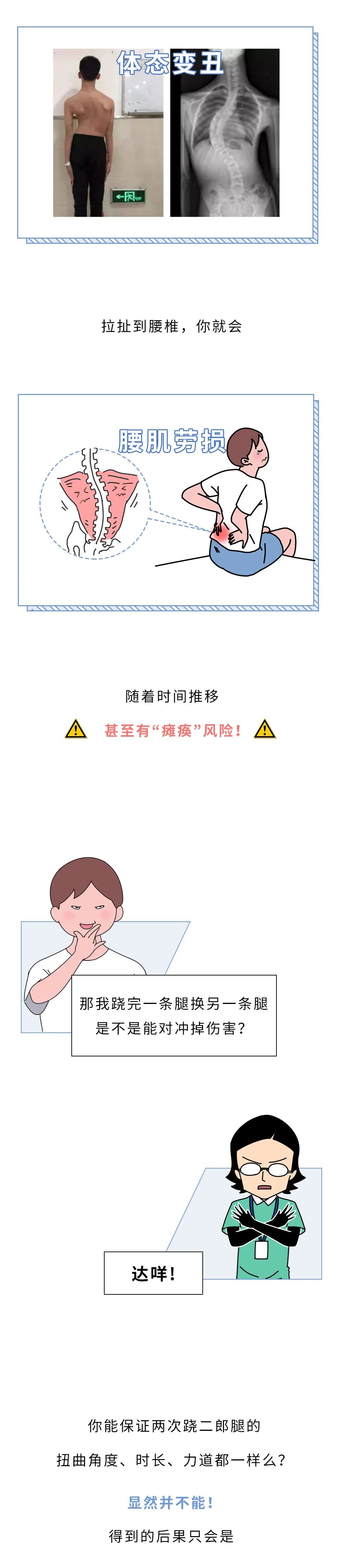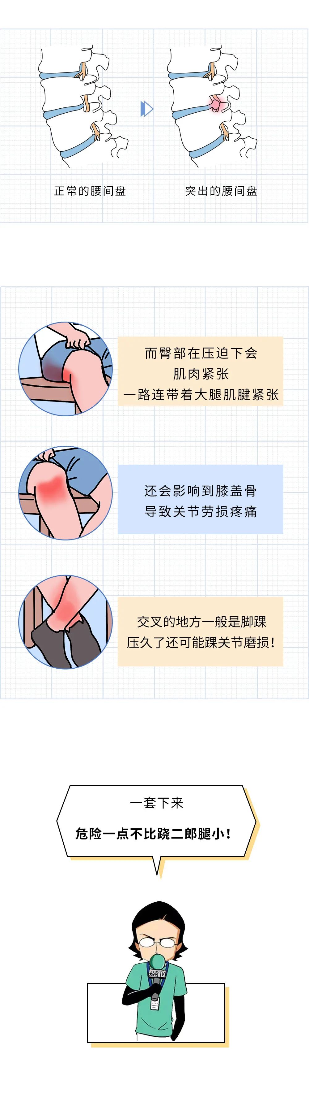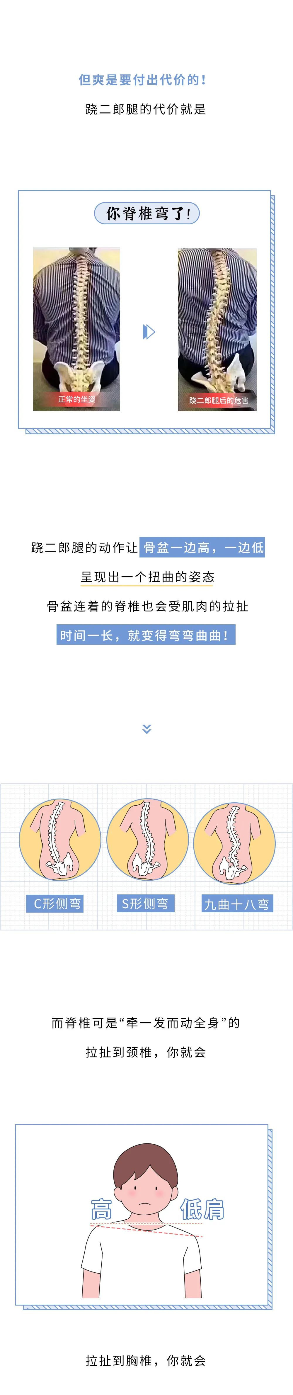 参考文献: [1] .上海市第六人民医院东院.袁锋.《翘二郎腿对身体到底有哪些影响?》 [2] .科普中国.警惕!比跷二郎腿更伤身体,这种坐姿很多人喜欢 [3] .孙悦礼.上海中医药大学中医骨