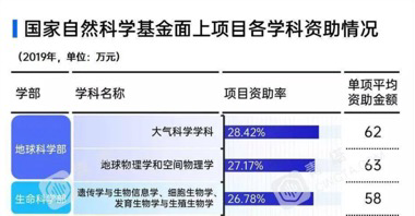 总体申请难度在增加。其中,地球科学部的大气科学学科、 地球物理学和空间物理学2个学科项目资助率最高,分别为28.42%和 27.17%;医学科学部中医学科学十处(中医学、中药学、中西医结合学)项目资助率最低,仅为 13.36%。